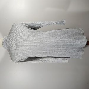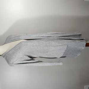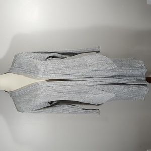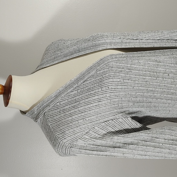 Lo-Hi 3/4 sleeve open front cardigan with front pockets. Grey knit with vertical stripes for slimming look. Lightweight fabric. Perfect with jeans, trousers or leggings.