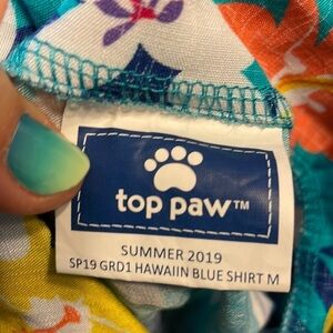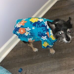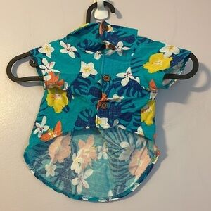 Top Paw Rayon Teal Floral Hawaiian Shirt size M dog. Very good preowned condition. Velcro closure. Fake buttons down “front” chest area. Modeled by a chihuahua yorkie mix 8lb dog. See pictures for measurements.