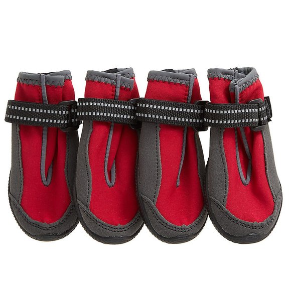 Fashionable dog boots by Top Paw. Red and gray with secure straps. Ideal for walks and play.