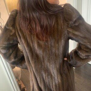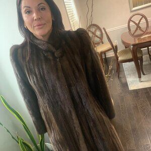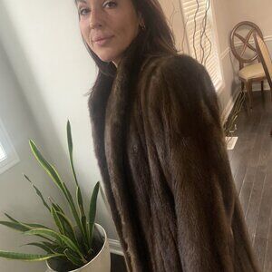 Top Quality Natural Full-Length Female Mahoghany Mink Coat. This superb-quality natural female mink coat was owned by a younger female who wore the garment three times and was kept it in refrigerated fur storage at all other times. It fits sizes 6-8. Original purchase price was estimated at $12,000 from Flemington Furs in Flemington, New Jersey. I worked in a fur salon for 10 years and can assure you that this coat is as fine as can be purchased from any salon. The coat is "fully let-out", a manufacturing procedure that is used to stylize and put "sway"only in better furs (see last photo). The silk lining of the coat contains a small monogram that can be easily covered by any seamstress with a cell phone pocket. Coat has two side pockets for your gloves. The coat can be shipped to any US location without additional charge. Any furrier can easily shorten/lengthen sleeves, reposition fasteners, shorten coat length, etc. The model in the photo is size 6 and is 5'6" tall. If you have never worn mink, it is soft, incredibly warm, and suitable for any occasion. THIS IS A CHRISTMAS GIFT YOUR SIGNIFICANT OTHER WILL NEVER FORGET.