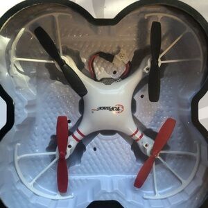A multi-function drone with throw-launch capability; low/medium/high speeds; long range control; and many other features! The set features: a 6”x6” drone; battery operated remote control (batteries not included); charging cables; and replace blades. Pre-used and fully functional and in excellent condition!