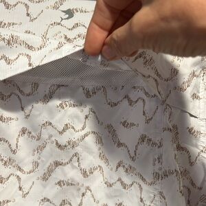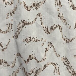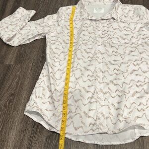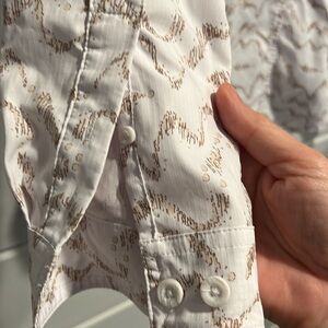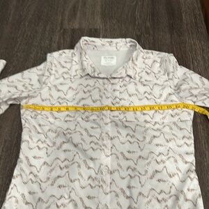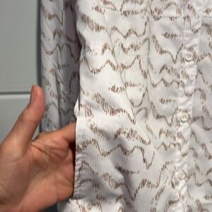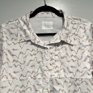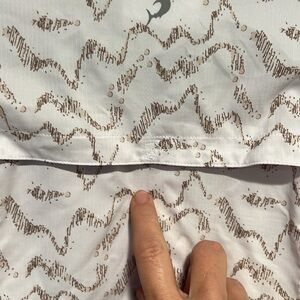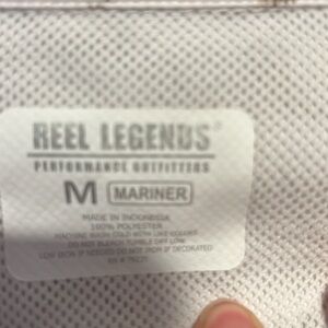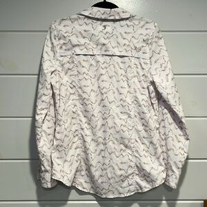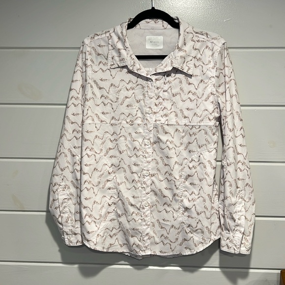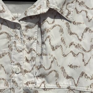 Reel Legends “Mariner” women’s button down shirt with three front pockets, a vent in the back and roll up sleeves. Fabric is 100% polyester. Color is white and tan design.
