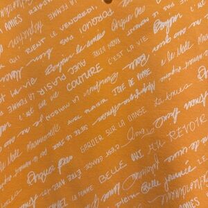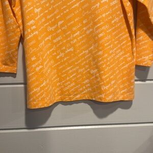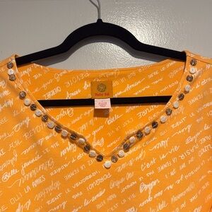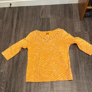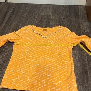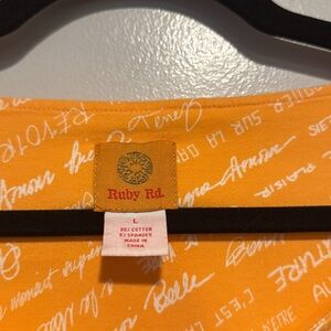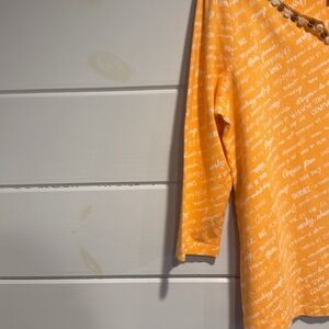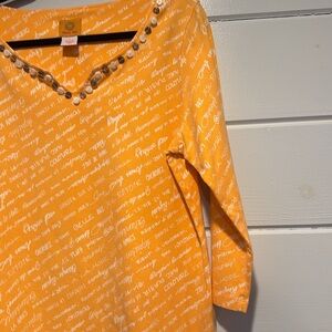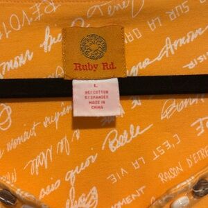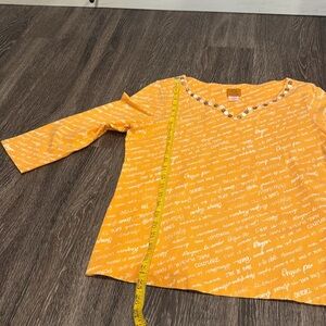 Ruby Rd. Top with 3/4 sleeves and scoop neck with button accents. Fabric is 95% cotton, 5% spandex. Color is orange with white accent.
