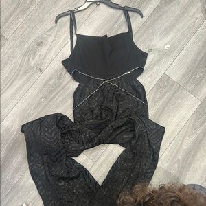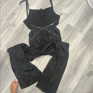 This elegant black romper black pants set dress features stunning beaded crystal accents, perfect for any special occasion. Its sleek design offers a sophisticated look. Has two cutout side to side. New with tags, silk like material! Wife pant leg and super chic!