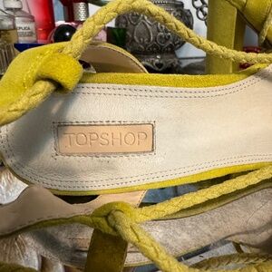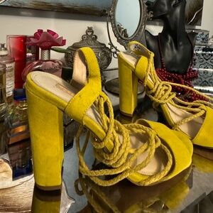 Top Shop lime yellow suede open toe shoes. clunky heel. Strap wraps around up to calf. The shies are beautiful and rarely worn. Almost new.