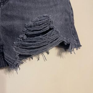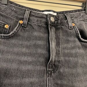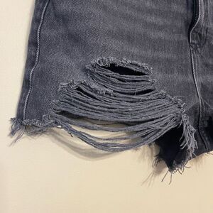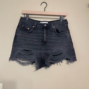 TopShop Womens Washed Black Grey Distressed Denim Mom Shorts Size 8. Excellent used condition. Heavily distressed in the front. Fringed hems, minor distressing on waist band. Zip fly with button closure. 5 pocket style. Black wash denim jean shorts. All items from smoke free, pet friendly home. Open to offers and bundle for a discount!