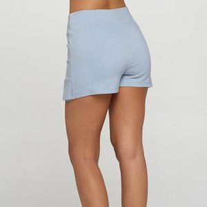 Bottom: A twill skort featuring solid color, high waisted, double front slits, and a mini length.