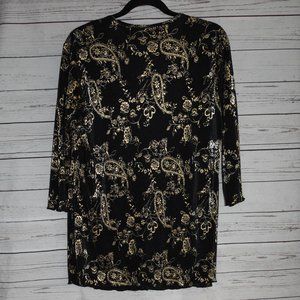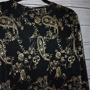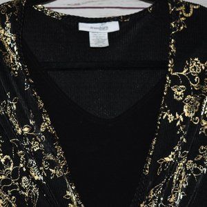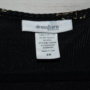 Dress barn black/gold top. Mock black shell. Size 3X, but fits more like an XL. 3/4 sleeve. Ring embellishment in front. No picks on fabric. Good condition.