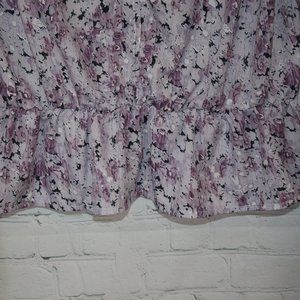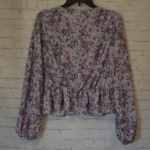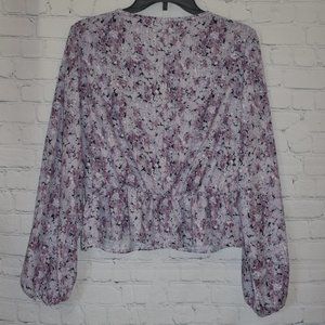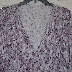 Purple/black deep front V top, long sleeved with elastic around waist. Material has a silky feel. Size XL. Great condition!