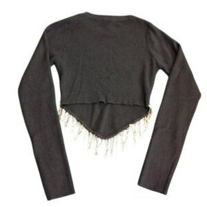 This ribbed long-sleeve top exudes sophistication, featuring a rhinestone fringe hem for a touch of elegance. An excellent choice for polished styling. • Ribbed texture for a sleek look • Rhinestone fringe detail adds sparkle • Medium-sized fit • Long sleeves for coverage • Soft and comfortable material
