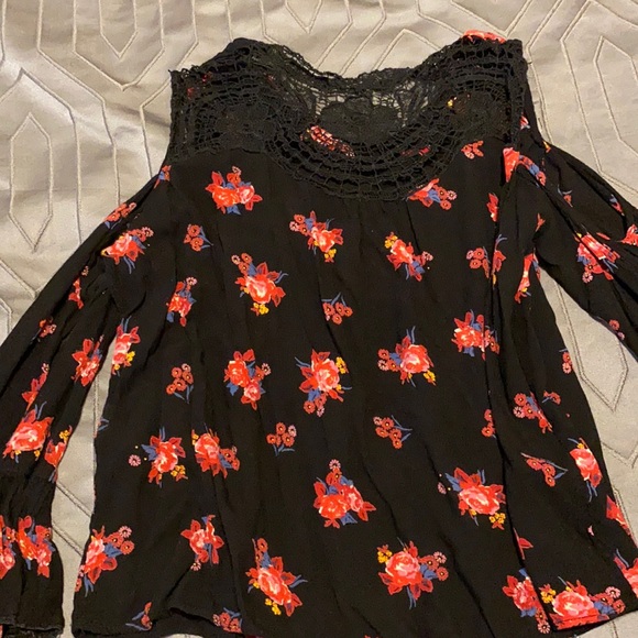 Black and red top blouse with open shoulder sleeve