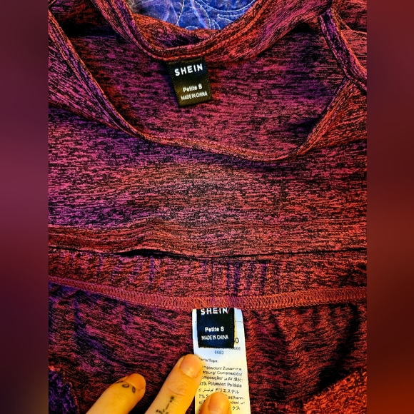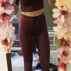 Cute top and bottom set, light weight material, good for warmer weather. Color is kind of a pinkish purple and black. There is a tie at the waist on the bottoms that is just for look, non functional.
