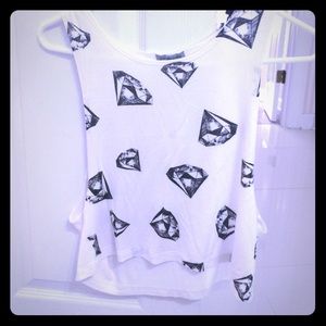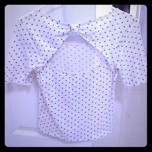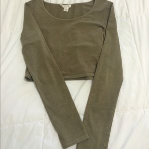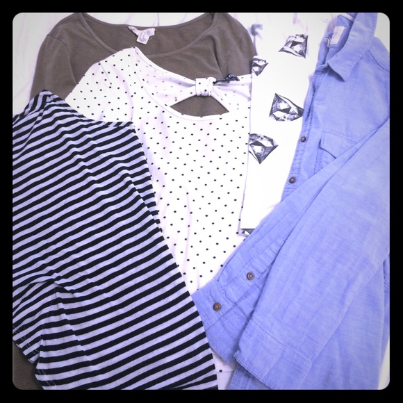 5 tops that include an olive green crop top, a black and white striped fitted poncho crop top, a denim long sleeve button up, a diamond printed crop top with wide open sleeves, and a polka dotted tight fitted top with a bow in the back. These tops are all mediums except the diamond top and striped poncho, because these two are smalls but they are stretchy so would fit mediums.