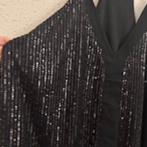 Black sleeveless sequin top with a flattering V-neckline and a soft, flowy fit. Fully lined for comfort (no itching!) and designed to catch the light beautifully. Perfect for night outs, parties, dinners, concerts, or any occasion where you want to shine effortlessly. Excellent condition, worn once, no flaws and no missing sequins.