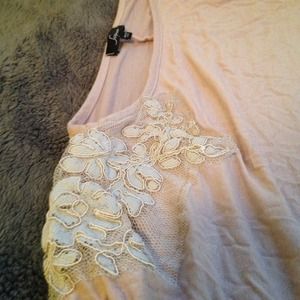 Pinkish grayish foley top with grey flower design on right shoulder