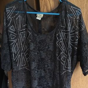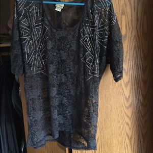 Gray lace top with silver studs on the shoulders.m from The Buckle. Tighter at the bottom and loose at top. Lightly worn, just too big for me.