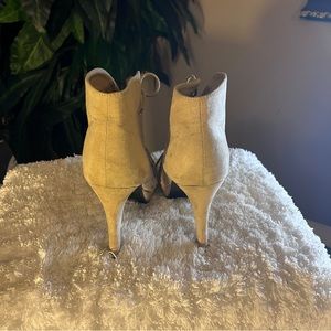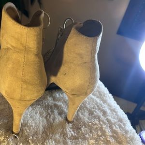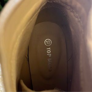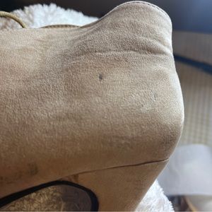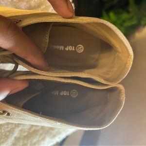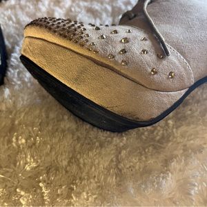 Women top moda platform and tan with gold rhinestones on the tip of the shoelace up stilettos gently used and black marks around the shoe size 10