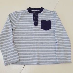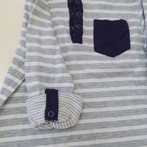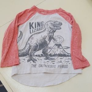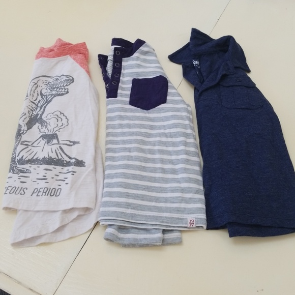 Overall good condition. Dinosaur shirt has tiny stain on one arm and striped has hole in collar of neck where seam is coming apart.