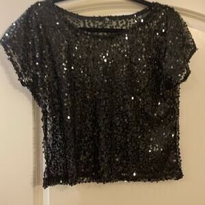 Top sheer black with sequins 18” long 38” bust size medium scoop neck
