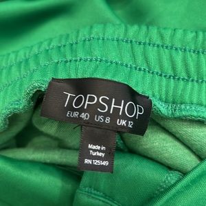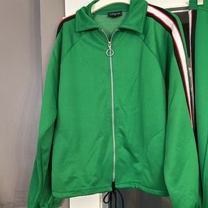 Unisex green tracksuit from top shop size 8 us has elastic waist and button and zipper fly. No side pockets on the pants but jacket does new with out tags
