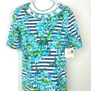 Top tshirt short elbow length sleeve striped floral Silver Metal Embellished NWT