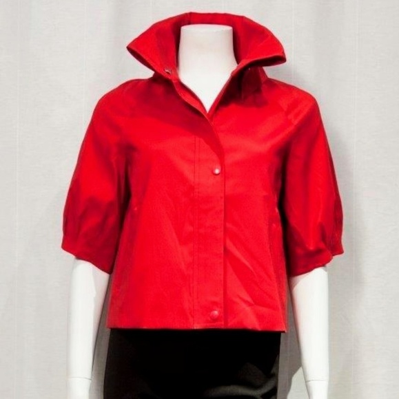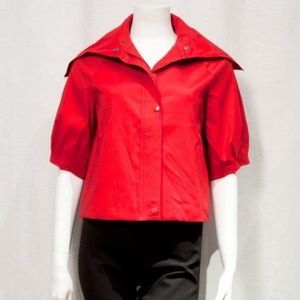 Simply beautiful stretch top jacket with signature high collar, front zipper and snap closure, and side pockets.