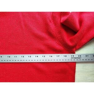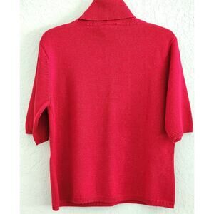 Nice red wool blend top by Talbots. This is a pullover turtleneck style. It has short - just above the elbows - sleeves. It is true red with gold metallic threads. It is a wool blend - 85% wool - 10% rayon - 5% metallic. It looks like it would be a short length hitting close to the waist. It is SIZE LARGE - BUT - it looks like it might run small. Please see measurements below and in the pictures to confirm your sizing before purchasing.