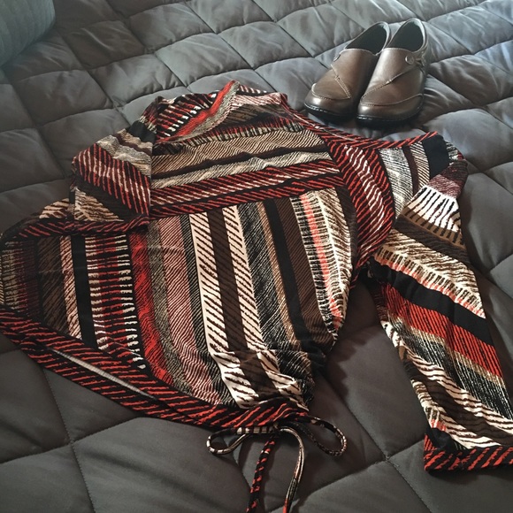 Beautiful patterned design top by Ruby Rd. Sleeves are 3/4 length. Shirred on one side with tie.95% rayon and 5% spandex. Machine wash. Extremely comfortable!