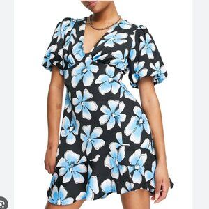 TopShop Black Blue Floral Puff Sleeve Open Back Mini Dress
