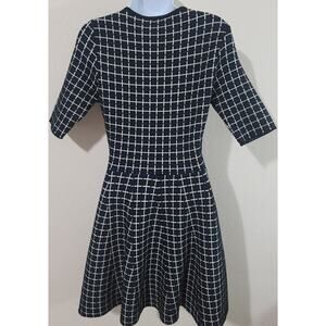 black blue white plaid, flowy, fit & flare, a line, short sleeves, round neck, skater, flippy, jacquard, stretch