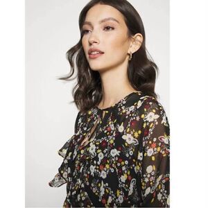 TopShop Black Floral Print V-Neck Ruffle Sheer Flounce Mini Dress in Multi, 12