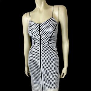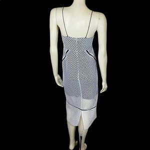 This slimming midi dress from TopShop features a sweetheart neckline with delicate cord spaghetti straps, on a black slip dress with a white mesh sheath overlay, which has a black accent down the center of the dress that cuts in at the waist. It's 89% polyester and 11% polyamide and is a size 6, which measures: