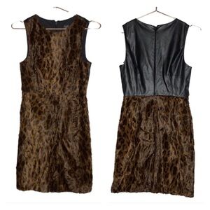 NWT TopShop Brown Leopard Faux Fur Sleeveless Sheath Mini Dress. Back is faux leather. No flaws. Size 2. Armpit to Armpit 16 inches. Shoulder to Hem 32 inches.