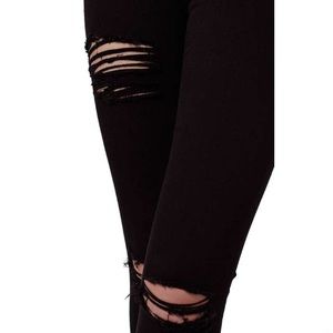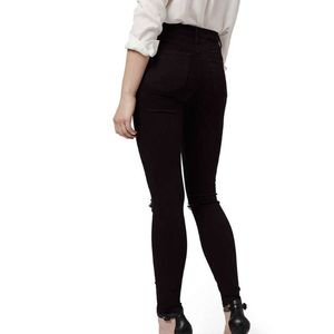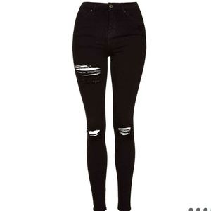 TopShop destroyed skinny ankle jeans. New with tag. High-waisted jeans hug every curve in sleek, stretch denim ripped at the knees and upper thigh for a trendy edge. Zip fly with button closure. Five-pocket style. Dark dye may to to light materials. Fiber content: 91% cotton, 6% polyester and 3 % elastane.