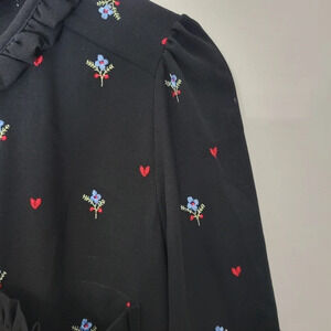 super cute TopShop floral embroidered dress sz 6, worn once and is in excellent condition! No holes, rips, stains or tears. Black dress with colorful global and heart embroidery, faux button detail, ruffle accents and has 2 functional pockets, hidden side zipper closure.