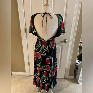 This is brand new with a store tag. It is a women’s size 0. This is a beautiful black dress with red and pink flowers throughout the dress. It has flutter sleeves and is a long flowing somewhat of a maxi dress. I did put the measurements in the pictures. The dress is made out of 100% polyester and the lining is also made out of 100% polyester. this dress zips in the back and then it also has a some strings at the top of the back near the neck where you just kind of tie that in a bow. All of my items are well cared for and from a smoke-free home and I price them at a reduced price. Considerate offers are welcome.