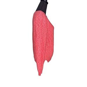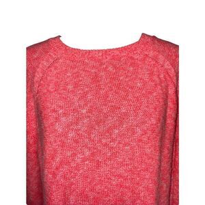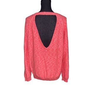 Pink and white marled open back sweater. Crewneck. Long sleeve. Ribbed knit cuff, collar, and hem. Size: 8. Preowned in good condition.