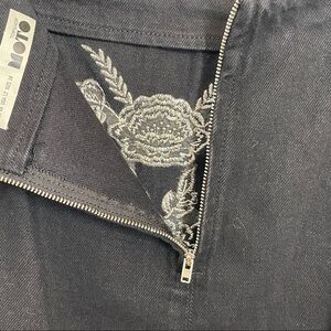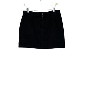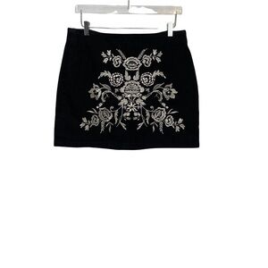 TopShop Moto mini in black denim with beautiful silver floral embroidery on the front. Back zip. Fun to wear with boots, white sneakers, or stilettos. Very versatile skirt. Excellent pre-owned condition. Size 12.