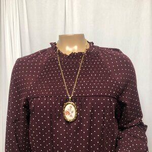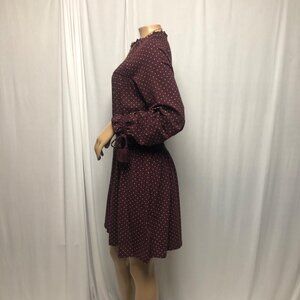 TopShop Peasant Dress Womens Size 10 Maroon White Polka Dots Smocked Long Sleeve