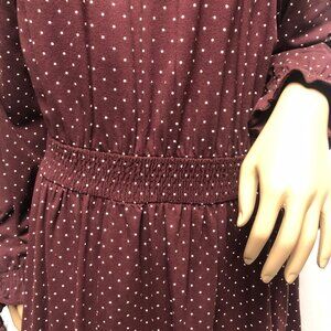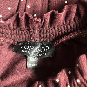 This TopShop Peasant Dress features a charming maroon color with white polka dots, smocked detailing, and long sleeves. Perfect for casual or semi-formal occasions, it offers a flattering fit and timeless style for any wardrobe.