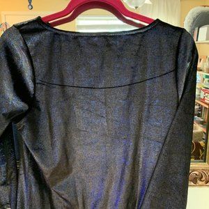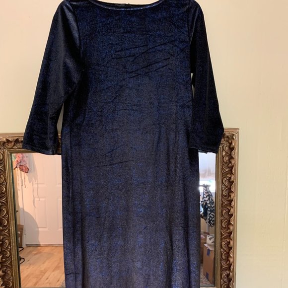 Gorgeous stretch velvet body con/wiggle dress. Can dress this up to be modern or the pinup style of your dreams! 3/4 sleeves. The velvet shines silver and blue (tried to capture in a photo). There is a line in the velvet at the back of the dress that was there when I purchased. Other lines are just wrinkles from hang-drying. Will come out with a steam. Otherwise great condition.