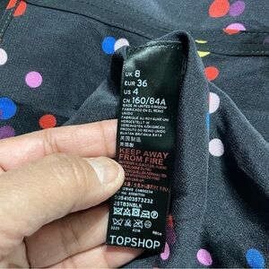 Top shop polka dot dress shirt. Colors of blue, pink, purple, yellow, and red. Great for a night out on the town and on a date.