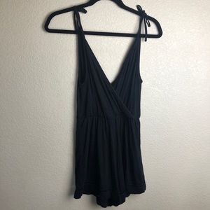 TopShop Romper with Tie paghetti straps, wrap neck line, loose shorts, and cut work lace trim.