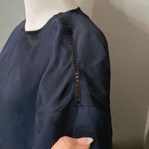 Textured rubbed fabric, short sleeves, peekaboo lace on sleeves, single back button closure, peplum hem.