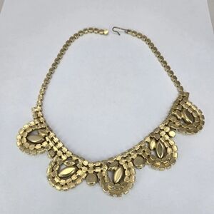This vintage choker necklace from the 1950s is a true statement piece featuring a beautiful leaf design pendant made of amber-colored rhinestones and a chain of topaz aurora borealis rhinestones. The necklace is in good condition, with an adjustable prong setting style and a leaf-shaped pendant that adds a touch of retro glamour to any outfit. The necklace measures 15 inches in length and has a hook closure, although the ring is missing.
