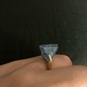 CCO Worn a handful of x’s before arthritis swole my fingers too much. Ring was specially designed for me by my husbands jeweler friend. It’s heavy white gold and a very uniquely cut stone. Pictures don’t do this ring justice. Uncertain the karat weight of stone. Measures 1/2” across the top of stone at the widest parts. {It’s a triangular shape}