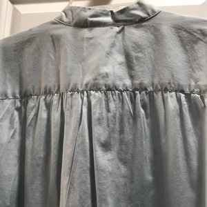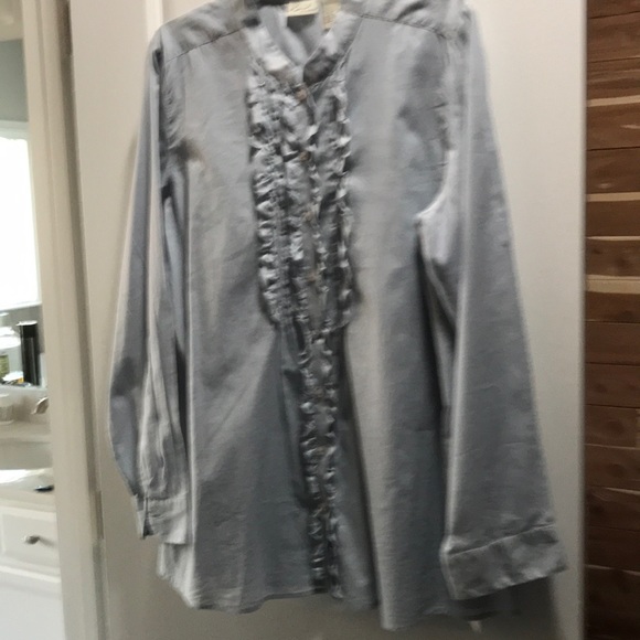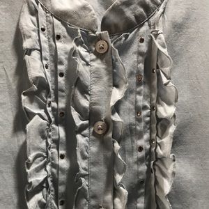 Blouse,long sleeved,blue with ruffle and silver tone studs down the front