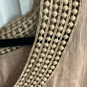 Maria Gabrielle pullover top, top in color, scoop neck, short valve type sleeve, size 3X like New, to pet is 23 inches length is 23 inches sleeves from shoulder 7 1/2 inches, opening on sleeve from shoulder to pit is 12 inches. See all photos no snags, stains. soft , lightweight, pretty binding around neckline and sleeves
