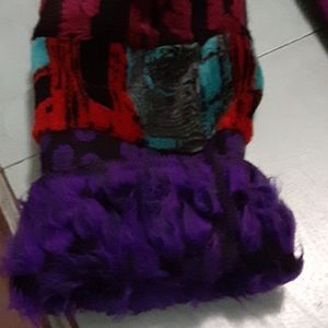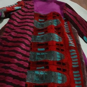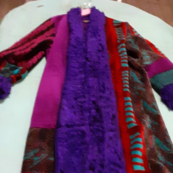 Gorgeous fabric of rich jewel tones. Made of a lightweight knit. Beautiful purple trim down front and sleeves