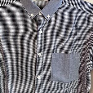 Excellent condition, only worn 1-2x! Blue/white gingham long sleeve button down with micro gingham contrasting collar and chest pocket. Slim fit. Looks great casually with jeans as well as dressed up under a navy or black suit jacket or blazer.